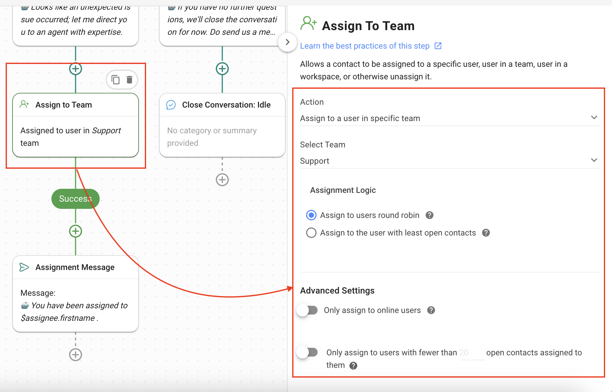 Assign to Team: Assigns the Contact to a team of agents using the Assign to Step.