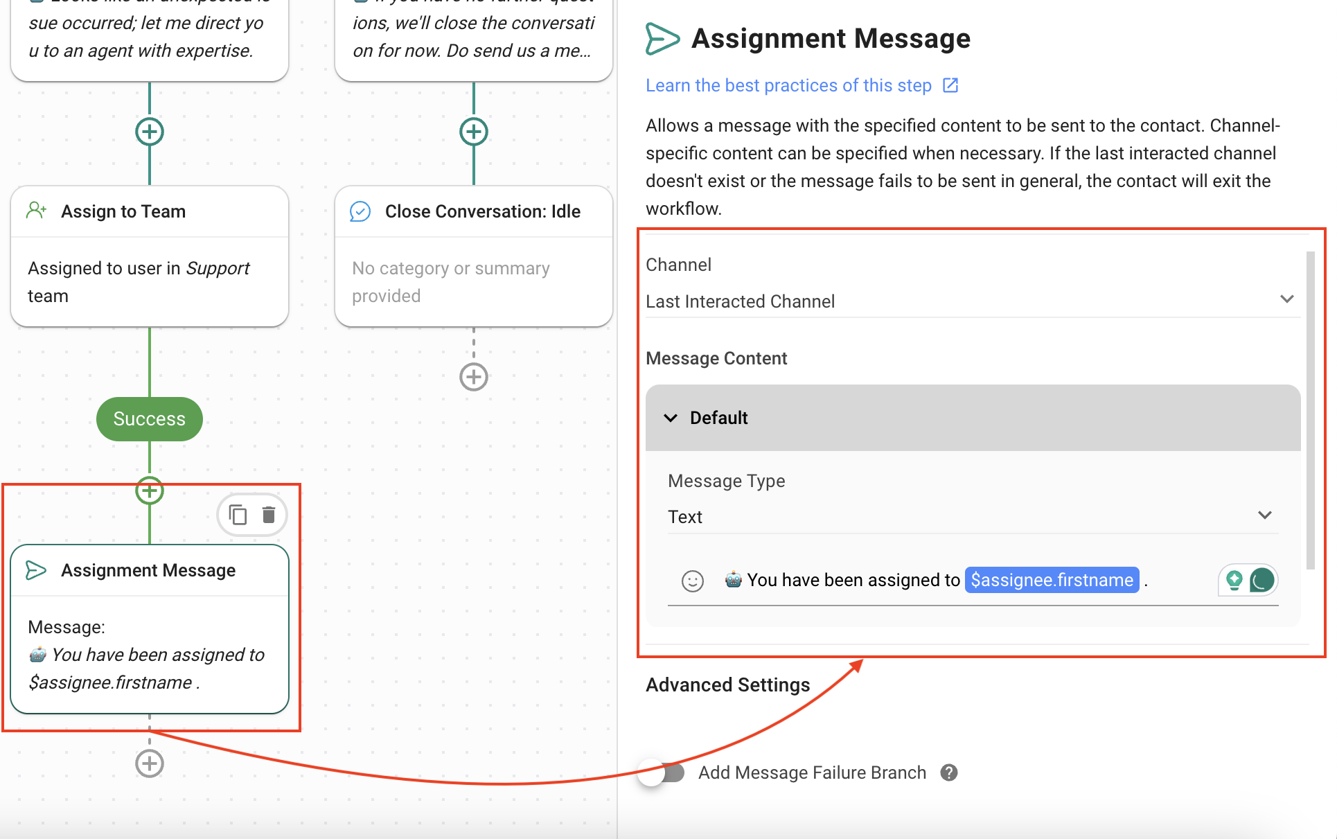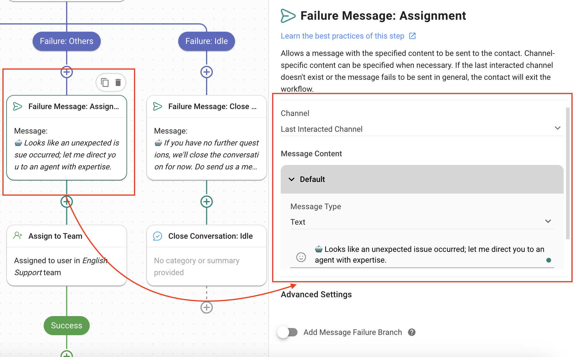 Failure Message: Assignment: This Step informs the Contact that an error occurred and they will be assigned to an agent soon using the Send a Message Step.