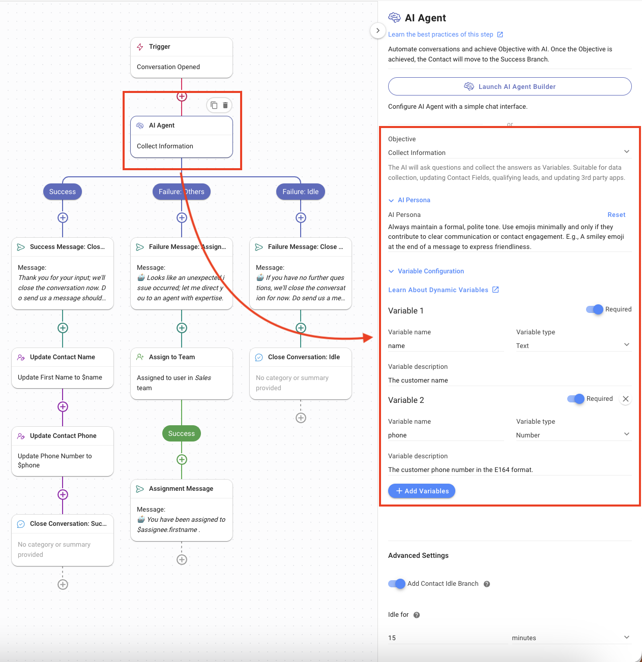 Variable Configuration: The information collected by AI is saved as variables. In this template: