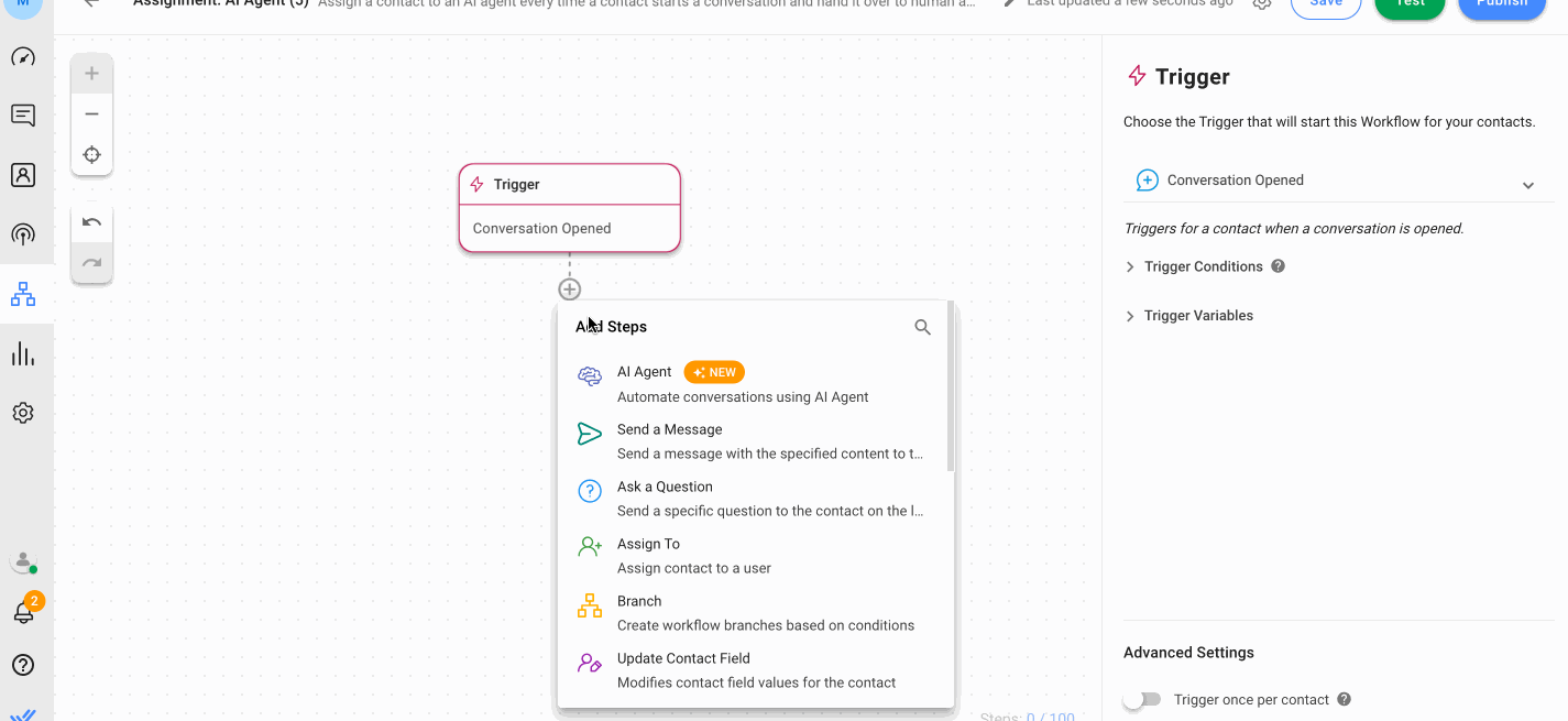 With the AI Agent Step, the workflow automatically enables AI Agent to respond to the Contact. The AI Agent Step configurations determine the kind of responses given by the AI Agent. The Knowledge Source, Snippets, and ability to reply outside of the Knowledge Sources determine the quality of the responses. The conversation continues until the Contact’s queries are satisfied.